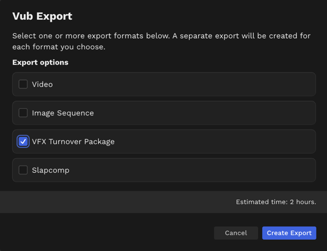 In the Vub Export panel that opens, select VFX Turnover Package: