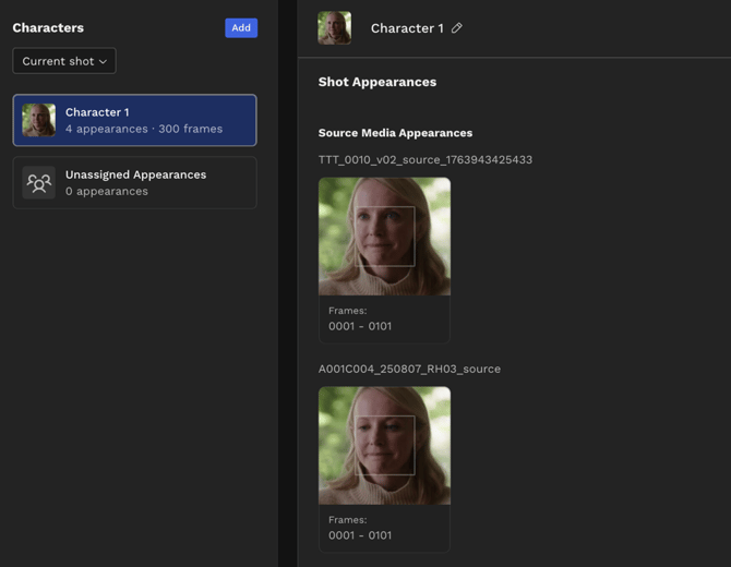 - Go to the Characters tab and ensure that the detected face of your vub character in the Final quality media has been identified as the same character as in the Draft quality media: