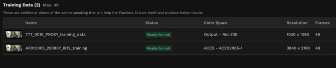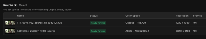- Once all media uploading is complete and you have selected the correct color space (and if needed, the frame rate) for your Final quality media, you will now have your Final quality Source media visible in your Shot Media tab and any Final quality Training Data also listed. Wait for the status of this media to become Ready to vub.